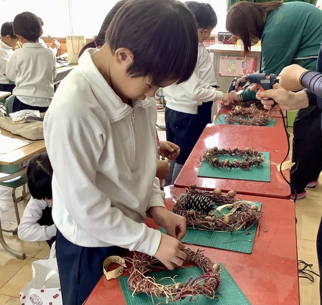 生活科で育てたアサガオのつるを使って作ったリースをデコレーションしました。クリスマス用の飾りをつけています。まだ少し先ですが、クリスマスのことを考えながら作るとわくわくが大きくなってきます。