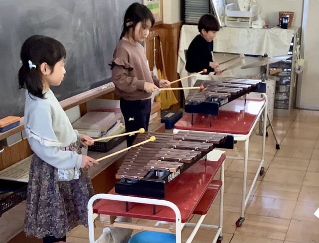 「アフリカンシンフォニー」の合奏の練習をしています。けんばんハーモニカは立って演奏できるようになってきました。