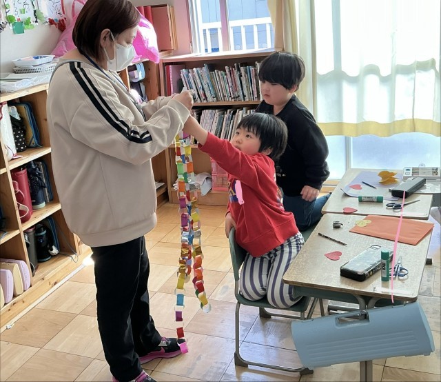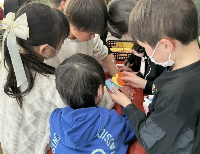 もうすぐ卒業を迎える、6年生のお兄さん、お姉さんへありがとうのメッセージを伝えます。手紙を書いてハートをたくさん飾ったり、輪っか飾りを作ったりしました。作っているうちに、もっとこうしたいというアイデアがわいてきて、工夫いっぱいの作品が仕上がりそうです。