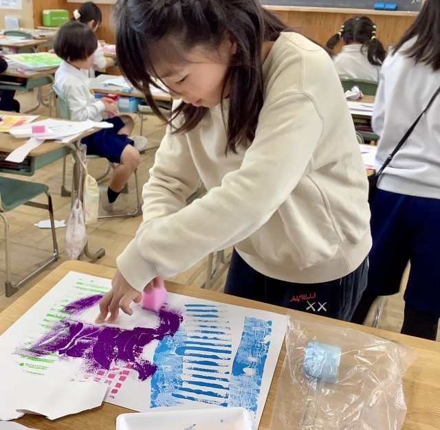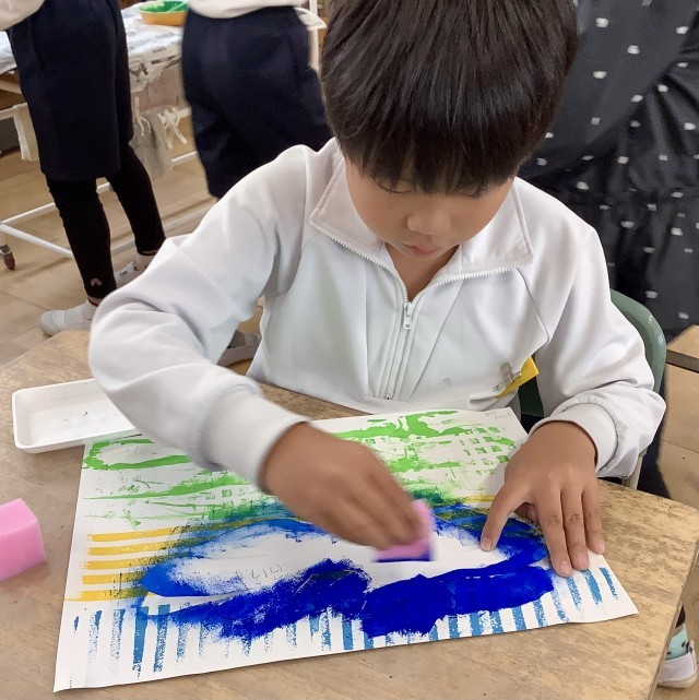 スポンジローラーを使って、背景に色や模様をつけたり、遠足で見つけた海の生き物の形をうつしとったりして作品を作っています。