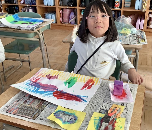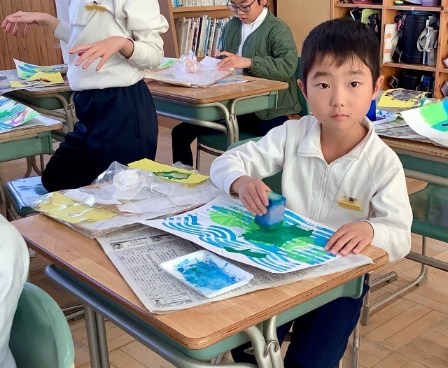 スポンジローラーを使って、背景に色や模様をつけたり、遠足で見つけた海の生き物の形をうつしとったりして作品を作っています。