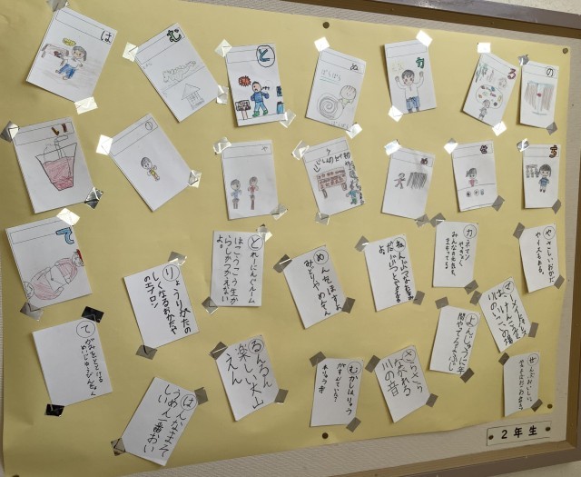 自分が住む町を探検し、見つけたことやすごいと思ったことなどから考えて、楽しいかるたをつくりました。「マーメイドパレスは けんこうづくりの いこいの場」や「カネマン薬局 みんなの元気を まもってる」など、この町のじまんの場所がたくさん出てきます。2年生のみんなの学習が、たくさんつまったかるたです。