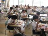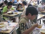 本日は、五目きしめんで、かつお節でだしをとり、鶏肉、かまぼこ、にんじん、小松菜、ねぎ、しいたけなど、たくさんの具材が入っています。
