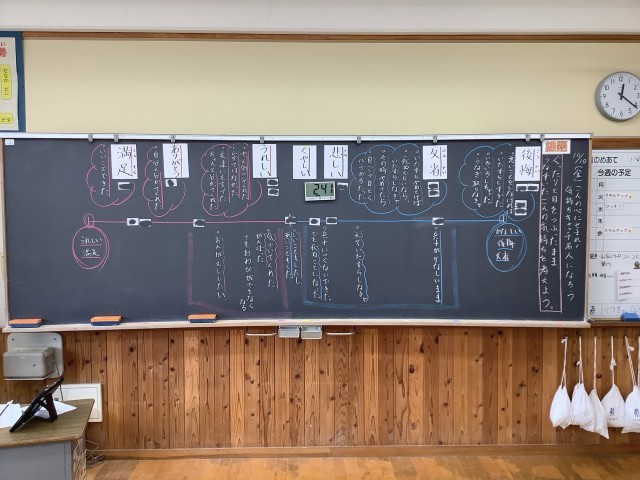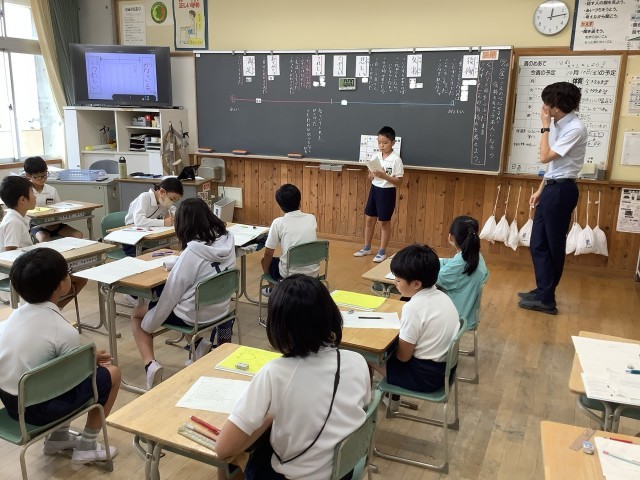 「ごんぎつね」の物語を読んで、登場人物の気持ちの変化を考える学習をしています。今日は、兵十に火縄銃で打たれてしまった「ごん」の気持ちを考えました。前時に一人読みでごんの気持ちを考え、今日の授業は自分の考えを発表するところから始まりました。