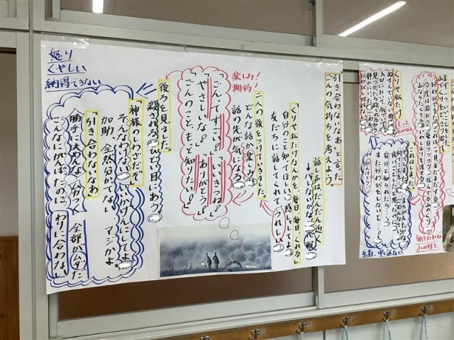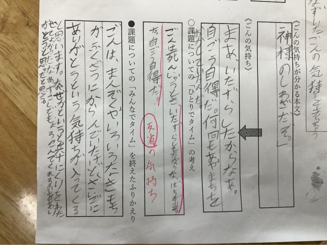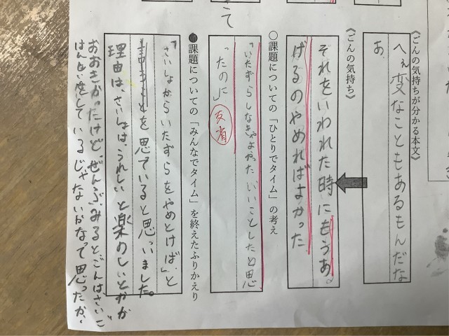 叙述をもとに考えた意見を伝え合う中で、ごんには「後悔」「反省」のようなマイナスの気持ちと、「うれしい」「満足」のようなプラスの気持ちが入り混じっていることがわかってきました。自分の考えと異なる意見の子に対して、「たしかに!」「なるほど!」という相槌が飛び交い、子ども同士で思考を深めていく様子がみられました。