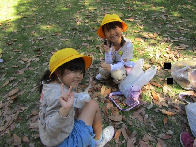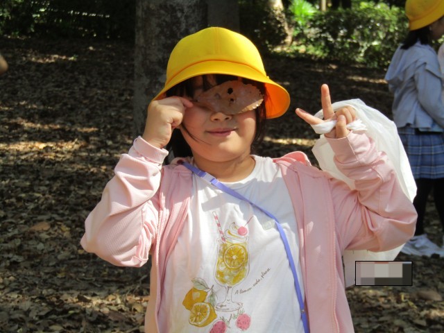 みんな夢中で拾ったり、葉っぱをお面にして遊んだりしました。
