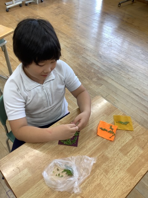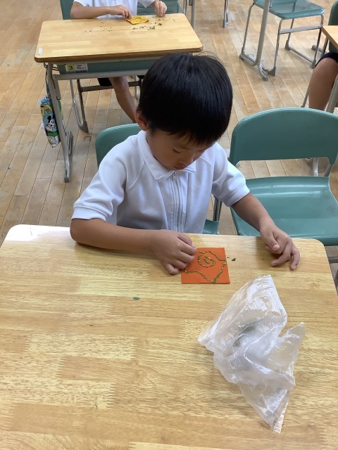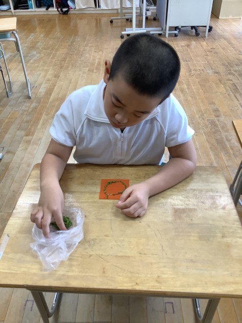 自分の好きな物を想像し、どのように置いたら想像した模様になるか考えながらくっつきむしを置いていました。