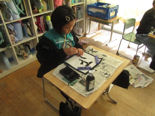 1組は、書写で書き初めに向けて「正月」を書きました。既習した内容に加え「はね」に気をつけて書いていきました。