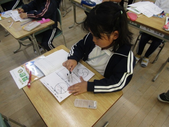 2組は、算数「円と球」で、コンパスを使って円を描きました。半径の長さを測って上手に描けるように練習しました。