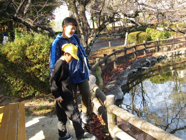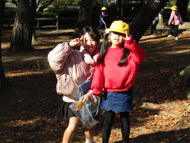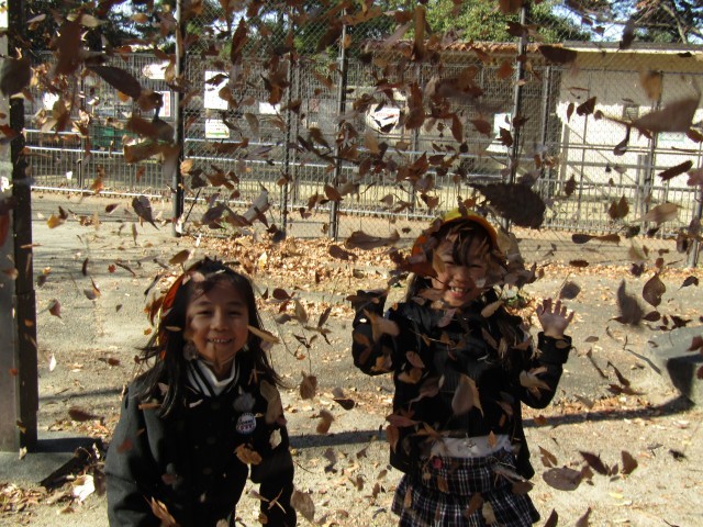 6年生と一緒に木の実を拾ったり、落ち葉シャワーをしたり、生き物をみたり…
