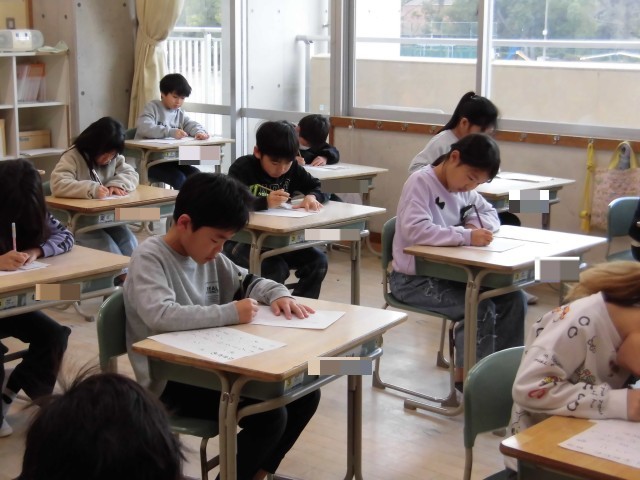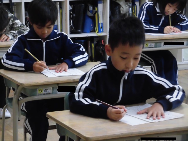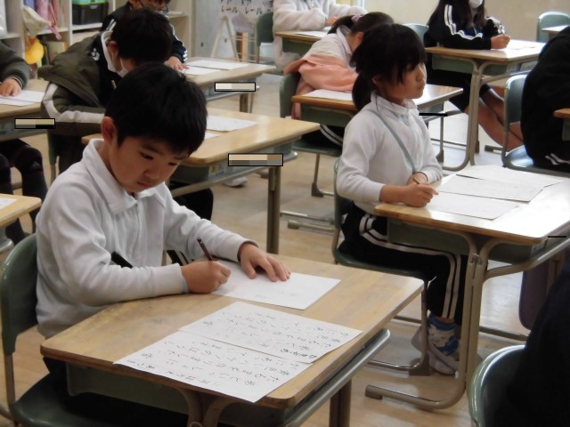 書き初め会をしました。1年生のときより、落ち着いた雰囲気のなか、丁寧に書いていました。たくさん練習をした成果が出せましたね、