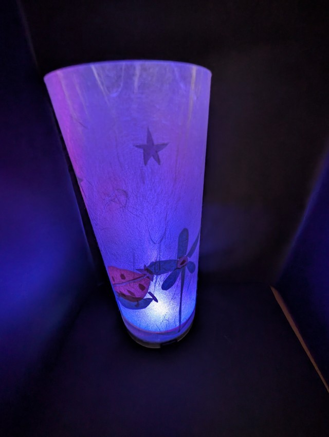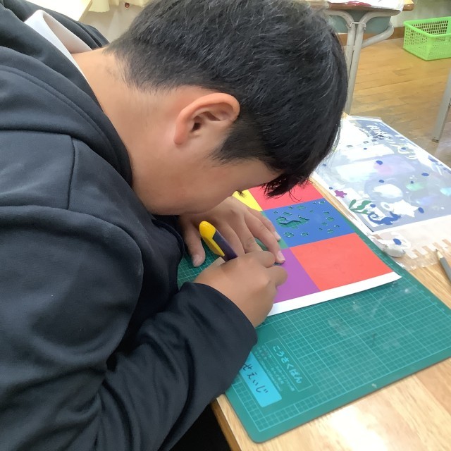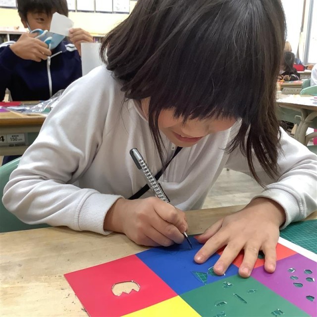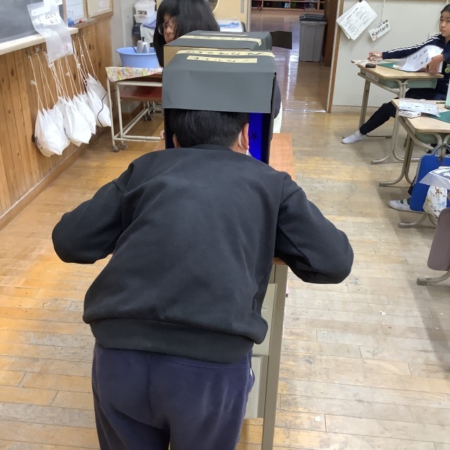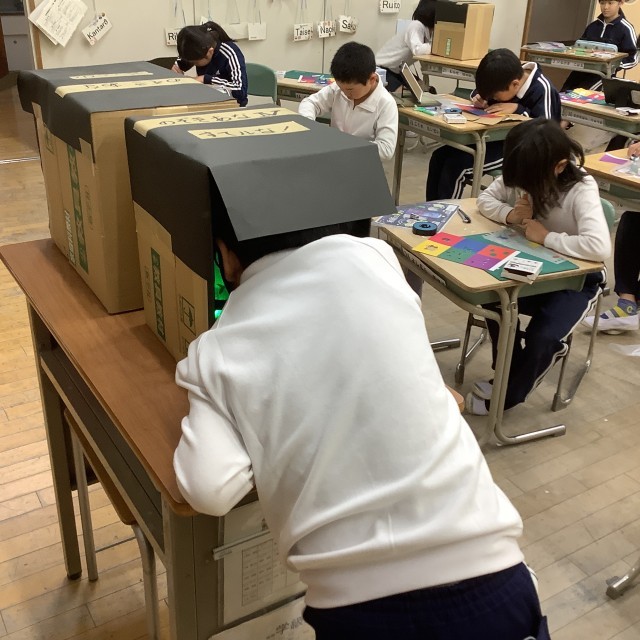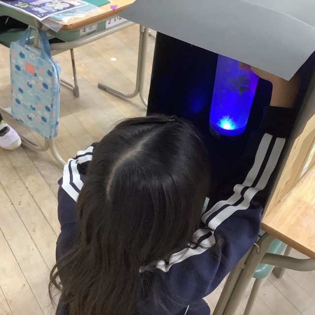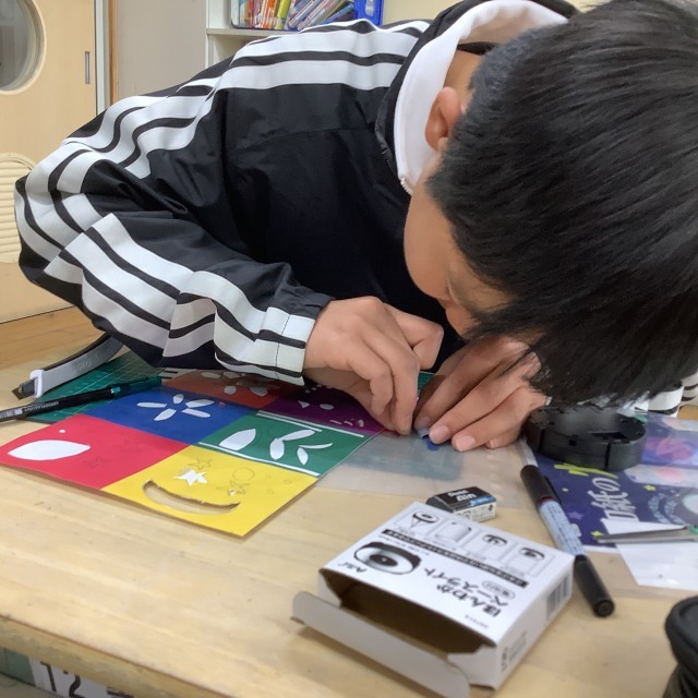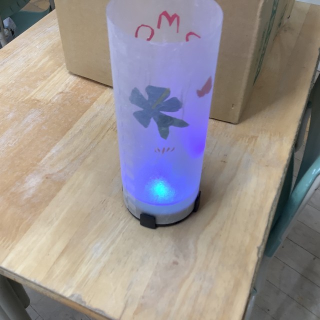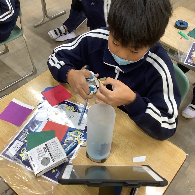 和紙の風合いや色、形の組み合わせを考えてランプをつくっています。明るいところだと「光の感じ」がわかりにくいため、段ボールに黒の画用紙を貼った箱をつくってみました。子どもたちは和紙を切り貼りして、こまめに光の感じを確かめていました。