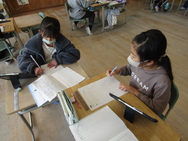 3組は、国語「クラスの思い出作りのために」。クラスの思い出作りにどんなことをしたいのかを、理由をくわしく話せるように、タブレットやノートにまとめていきました。