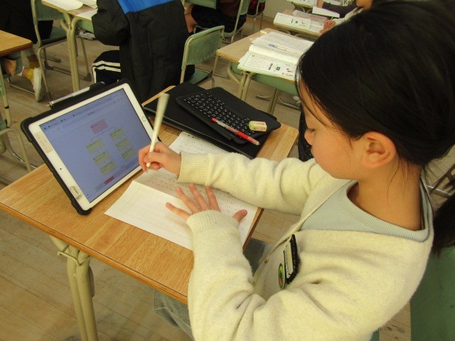 1組は、国語「道具のうつりかわりを説明しよう」。グループで一つ身近にある道具を決め、そのうつりかわりを調べて発表します。今回は道具を決めて、タブレットで調べてメモに取っていきました。