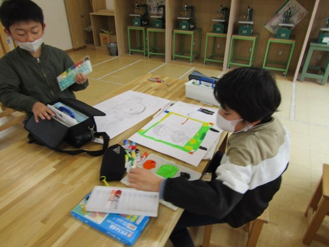 1組は、図画工作「未来へタイムスリップ!」。夢を叶えた瞬間をイメージして、今日から色付け作業に入ります。夢を現実にできるよう、まずはこの作品をしっかり完成させよう。