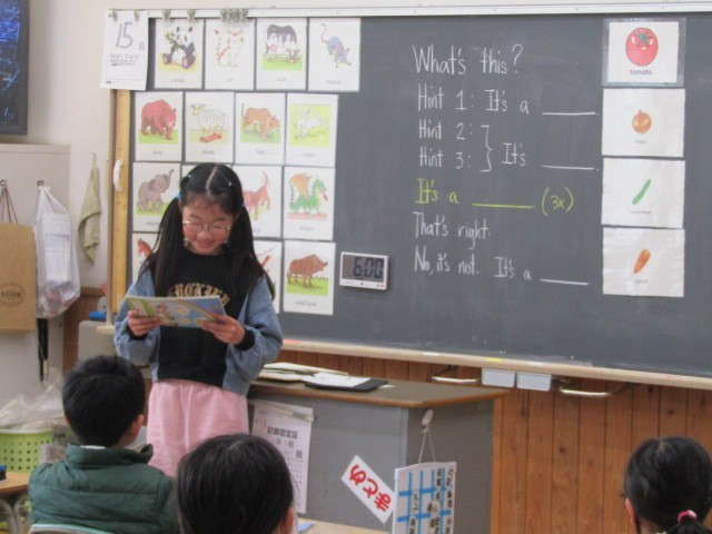 3組は、外国語活動「What’s this?」。今日は、自分で3つのヒントを考えて「What's this?クイズ」を発表していきました。友達のヒントで、正解にたどり着くことはできたでしょうか。