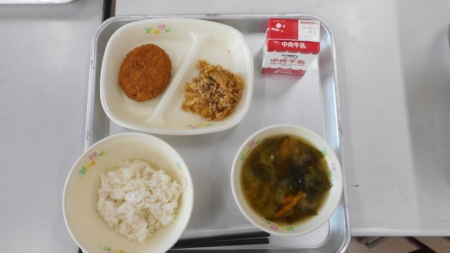 むぎごはん  ぎゅうにゅう  キムタクごはんの具  コロッケ  みそ汁