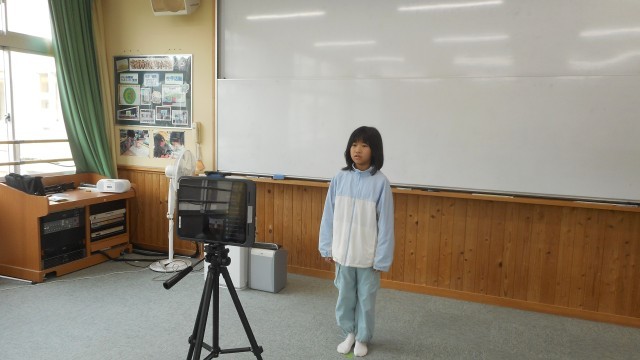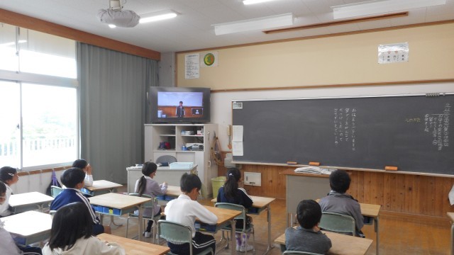 委員長が視聴覚室で前期の抱負を語り、全校児童が教室で視聴しました。