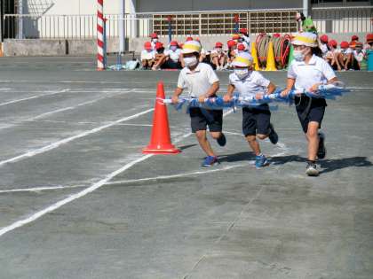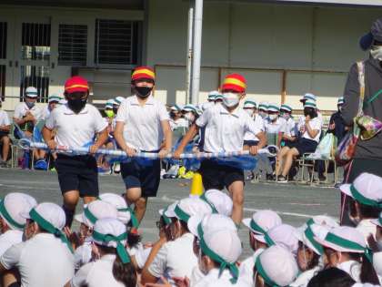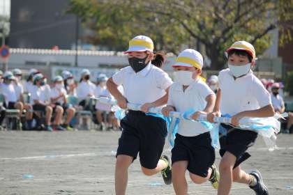 くすのき・さくら・ももの子どもたちも、それぞれ自分たちの学年の競技に出場して頑張りました。3・4年生は、「台風の目」に出場しました。チームになった友達と息を合わせて棒を持ち、走ったり、コーンを回ったりしました。
