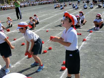 1・2年生は玉入れにも出場です。かごにめがけて玉をどんどん投げました。お片付け競争では、2年生が大活躍でした。
