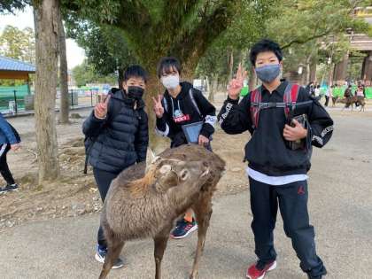 「鹿せんべい」片手に、鹿に追われている子もいました。