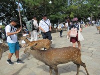 奈良公園ではたくさんの鹿に出会いました。鹿せんべいを上手にあげています。「せんべ...
