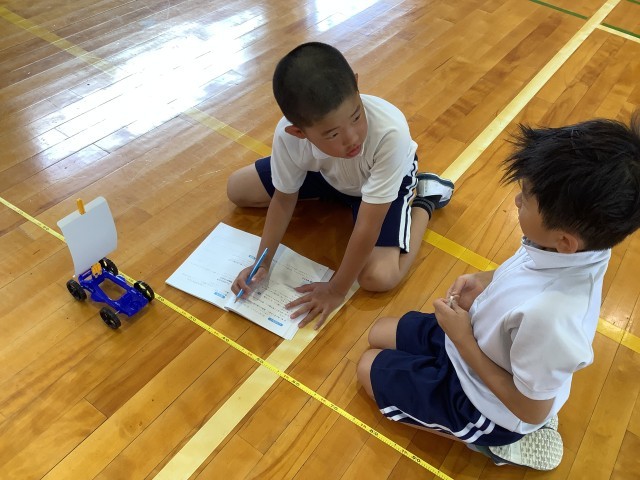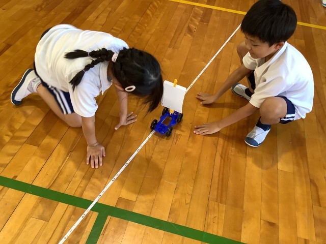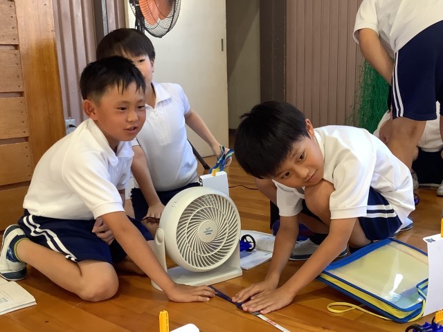 理科の学習では、風の働きについて学習しています。送風機を使って、風の強さによって物の動き方がどのように変わるかを、友達と協力して実験しました。勢いよく走る車に、「すごい!」とたくさんの笑顔があふれていました。