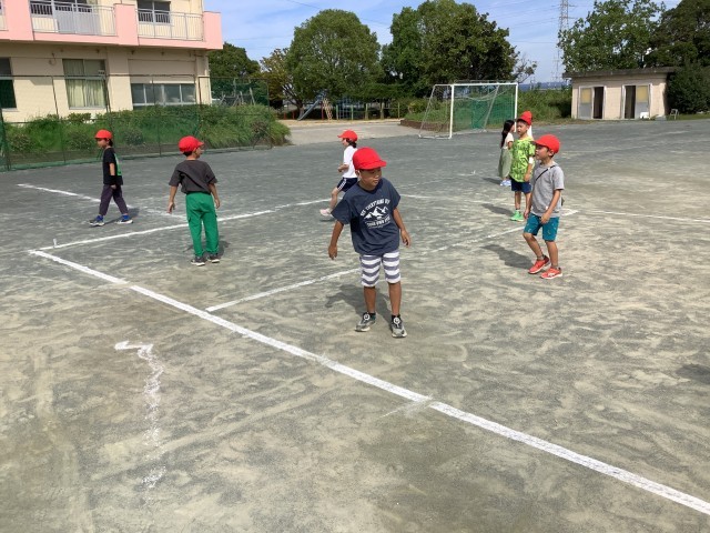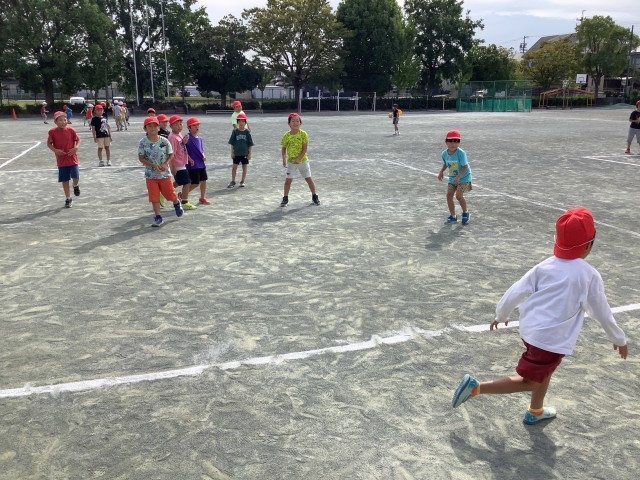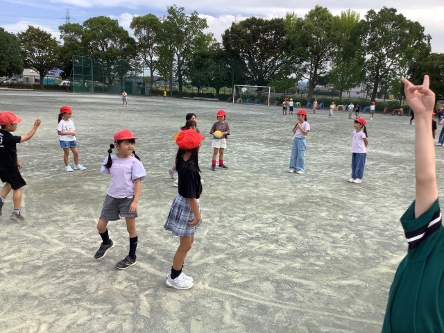 3年生になると、放課の時間もボールを使って遊ぶことができます。それを見据えて、2年生みんなでボールを使った遊び方の勉強をしました。グループごとに分かれてドッジボールをしたり、ボールあて鬼ごっこをしたりして、仲良く楽しんでいました。