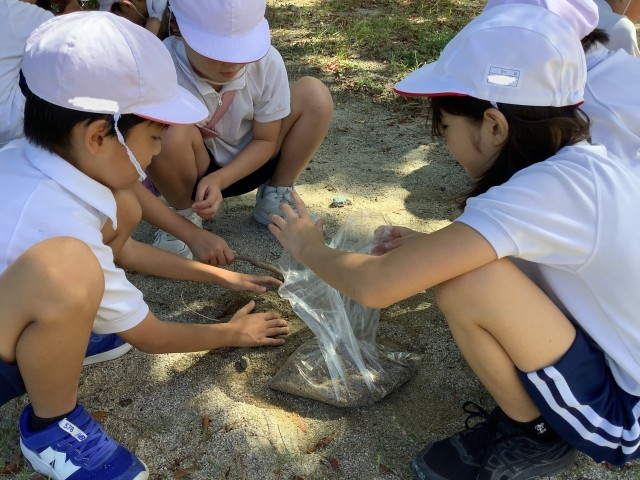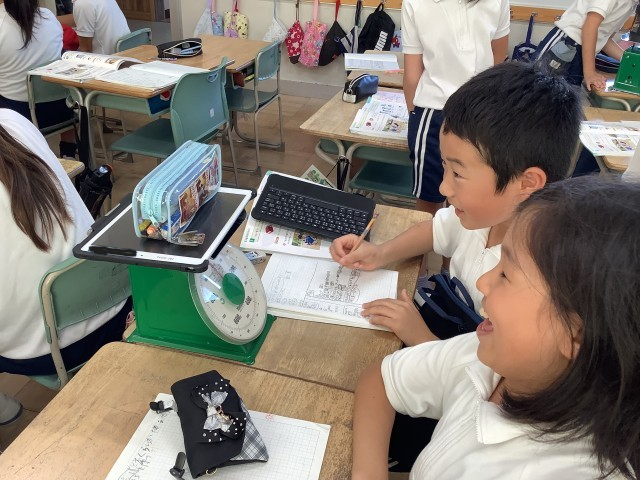 算数の学習では、1kgの重さを実際に作ってみました。袋に砂を入れて量感を養いました。「あと100gだ」「ああ~50g多い」など、楽しみながら活動しました。完成した1kgの袋を持ち上げて感覚をもち、教室では別のものを組み合わせて1kgを作ることができました。