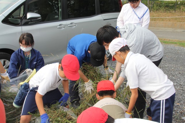 町内会の方々に、朝から学校周辺の草刈りをしていただきました。昼には、地域の企業の方がボランティアとして、児童とともに刈った草を袋に入れました。地域の方々のご支援に支えられていることに、感謝申し上げます。ありがとうございます。