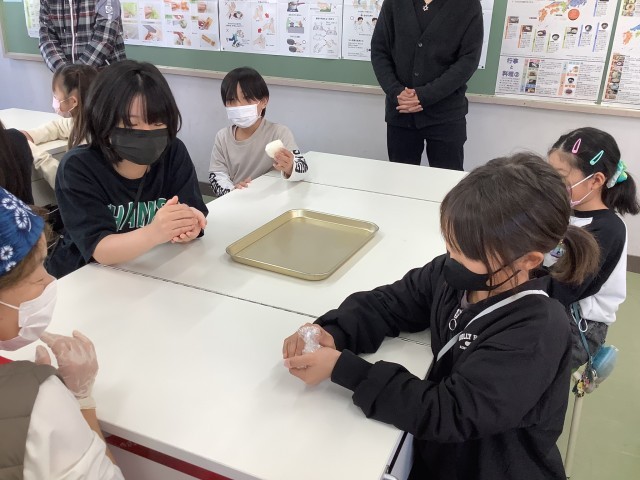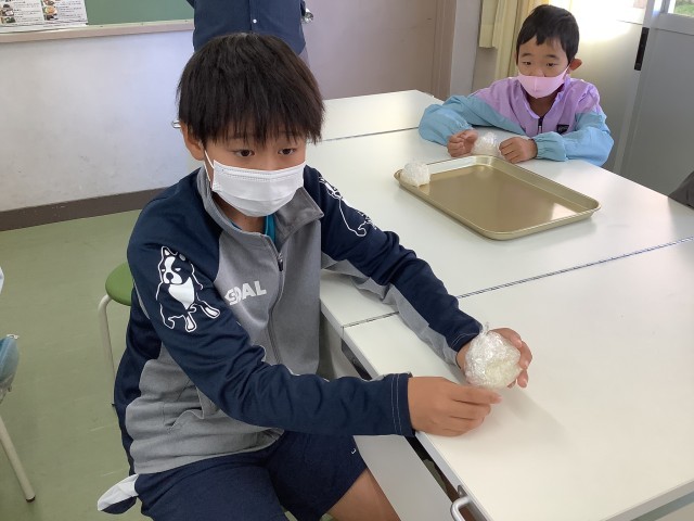 5月に自分たちで田植えをして、今月の10日に稲刈りを終えたばかりのお米を、おにぎりにして食べました。子どもたちは、自分のおにぎりをきれいな三角形になるまで握り、とても美味しそうに食べていました。