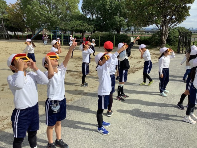 理科の学習では、太陽とかげの位置について調べる活動をしました。太陽を見るために遮光板を使って調べました。「太陽が緑色だ」「太陽の形がはっきり見える」など興味深く眺めていました。かげを繋げたり、かげで形を作ったりして楽しんでいました。