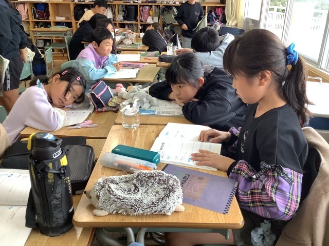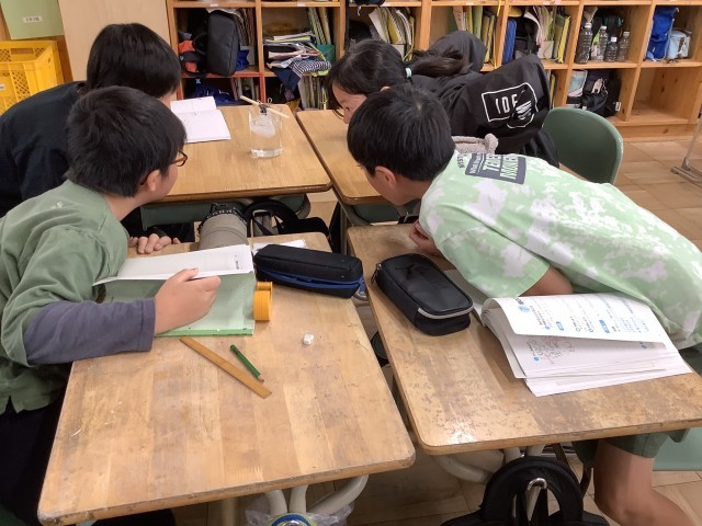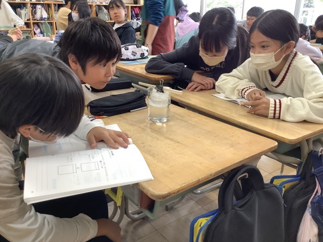 理科では、「物の溶け方」という単元を勉強しています。今日は、第1時間目ということで、食塩を水に溶かした時の、溶けていく様子を観察しました。子どもたちは溶けていく様子に見とれながら、「きれい・・・」とつぶやいていました。