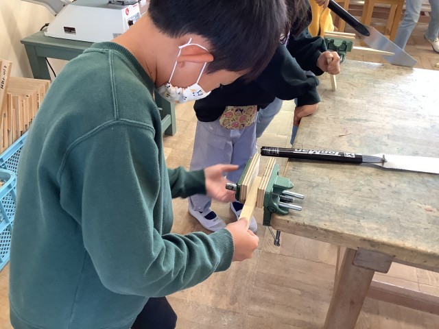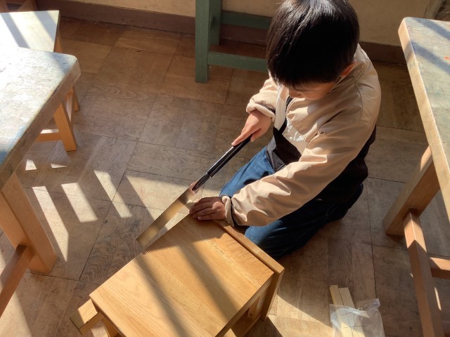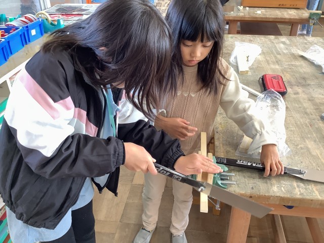 図工の授業では、のこぎりを使った作品づくりに向けて、角材を切っています。集中してのこぎりをにぎり、いろいろな形に切っていました。どんな作品ができあがるのか、楽しみです。