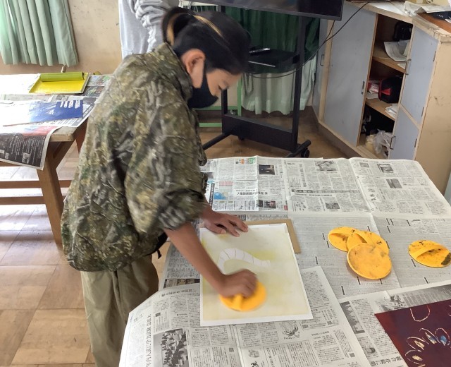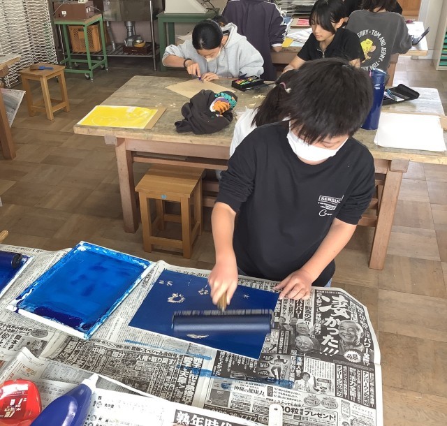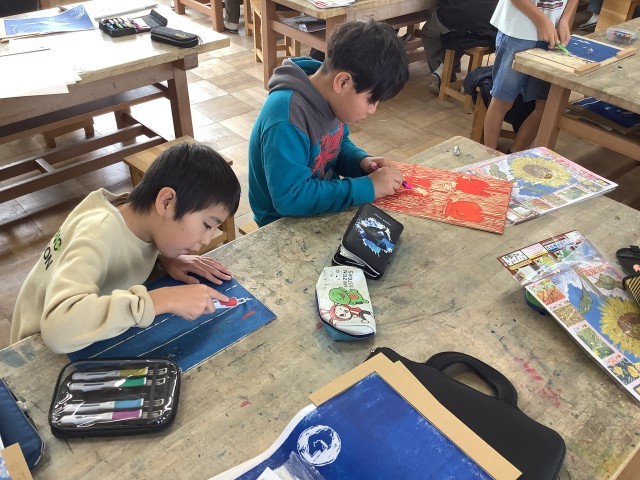 6年生では、図画工作科の学習で、多色刷り版画に挑戦しています。赤、青、黄、黒のインクを使って、一つの作品を作ります。赤➡青➡黄の順番に刷ると赤➡紫➡茶に、青➡黄➡赤の順番だと青➡緑➡茶になります。色の足し算をしながら、自分が思い描いた作品を目指してがんばっています。