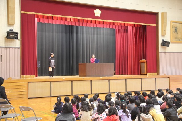 2学期の終業式を行いました。式では、校長先生が2学期にあった行事や授業の様子をスライドで紹介し、子どもたちが自分たちの学びや活動を振り返りやすいようにお話ししました。運動会や校外学習、日々の授業での頑張りなど、たくさんの思い出がよみがえり、子どもたちは真剣な表情でスライドを見つめていました。代表児童が2学期を振り返り、友達と協力して掃除をしたことや委員会活動でがんばったことを話し、3学期もこれまで以上に頑張っていきたいと発表しました。