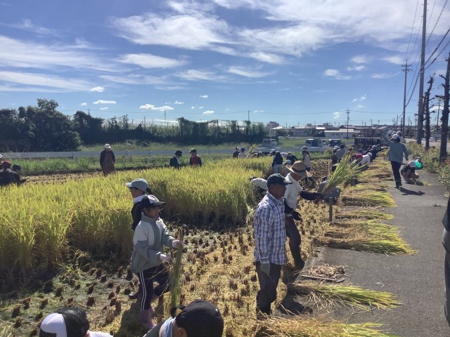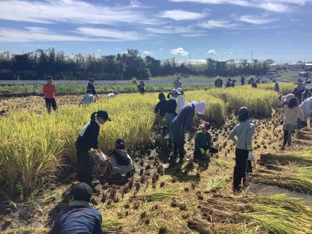 新保隊の方のご協力により、稲刈り体験を行いました。新保隊の方々に教えていただきながら、鎌で稲を刈ったり、しばったりすることができました。自分たちが食べているお米は、たくさんの人手と手間と時間がかかっていることを実感することができました。