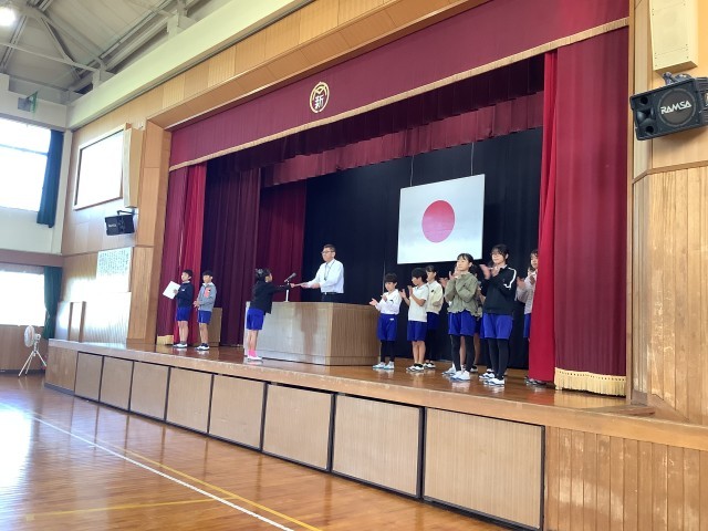 全校集会がありました。後期児童会役員・委員長・学級委員の任命をしました。児童会長さんは、「自分からあいさつできる新田っ子にしていきたい」とあいさつをしました。それぞれの委員長さんも、返事が立派でやる気を感じることができました。教育実習生さんからもお別れのあいさつがありました。「元気なあいさつを聞くと、今日も1日がんばろう」という気持ちになると話がありました。誰かにしてもらって挨拶を返すのではなく、進んであいさつや会釈ができるようになるようにしましょう。