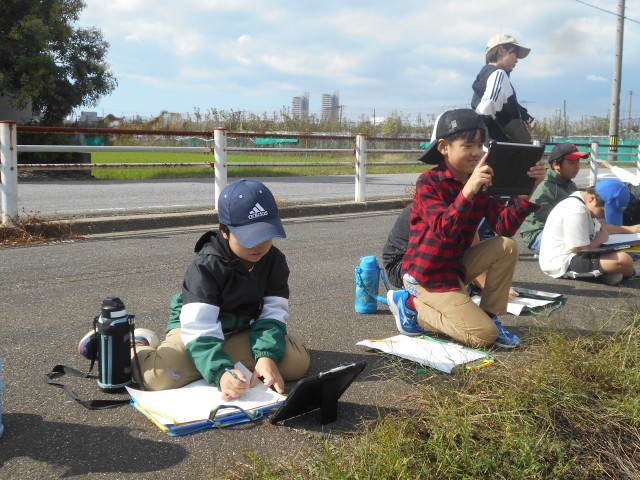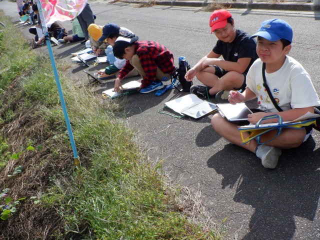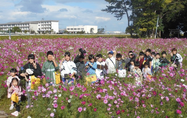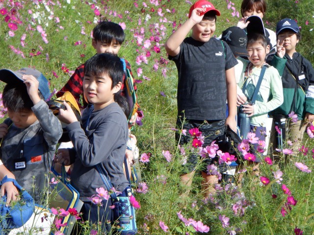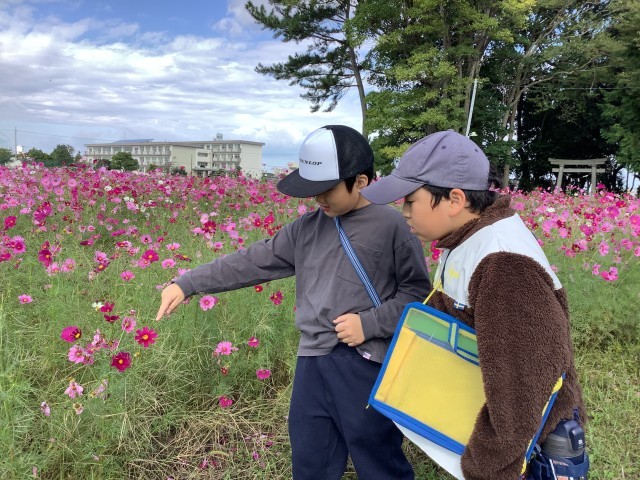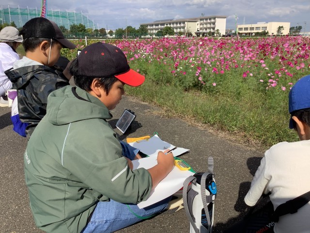 学校の近くのコスモス畑に、写生をしに行きました。沢山のコスモスを前に、「学校の近くに沢山咲いているんだね。」「朝通るからこの場所知っているよ。」