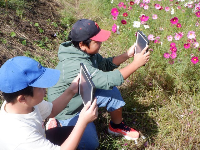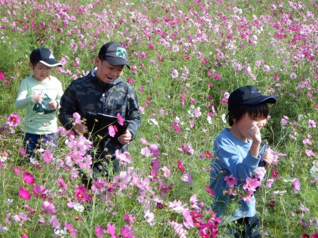 「ピンクと白があってかわいいね。」と感想をもちました。地域の人が育ててくれたコスモスを見て、自分が気に入った場所を決めて写真を撮りました。