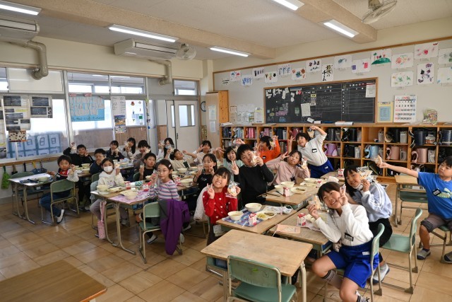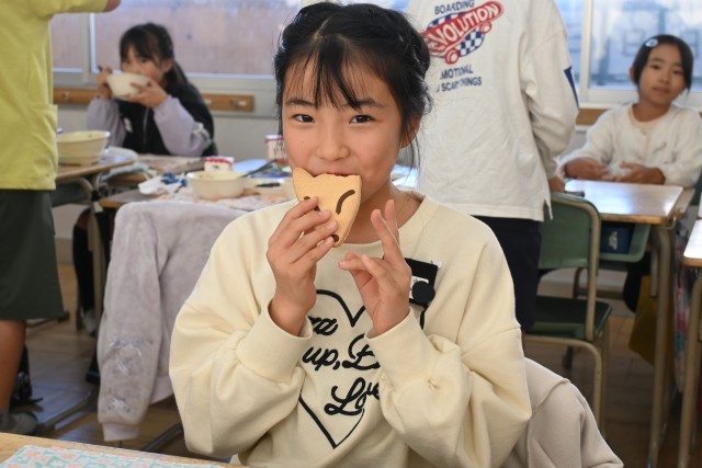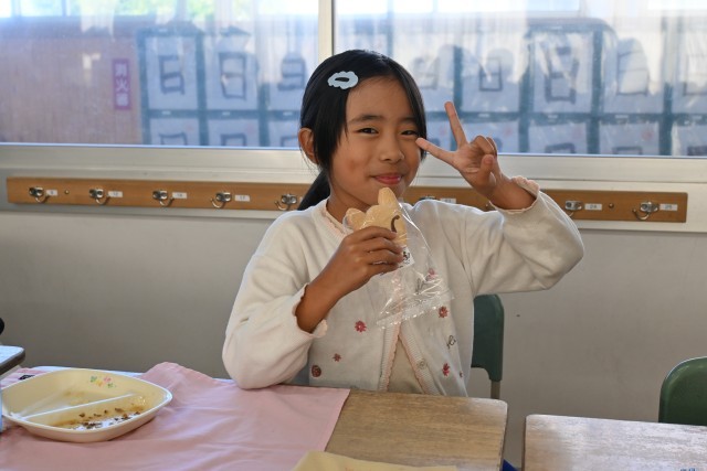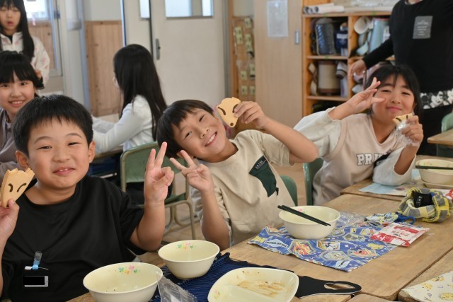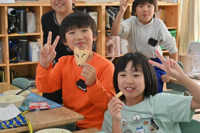 総合的な学習の時間で学んでいる新美南吉に関係するメニューが出ました。きつねの形をした「南吉からのおくりもの」を見て、「ごんぎつねに出てくるきつねだ。」「新田の森にある像も、ごんぎつねのごんと兵十なんだよね。」とこれまで調べてきたことを思い出していました。みんなおいしそうに食べていました。
