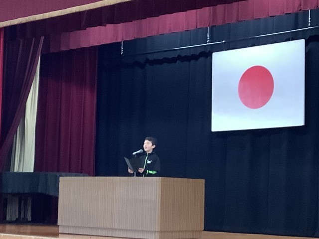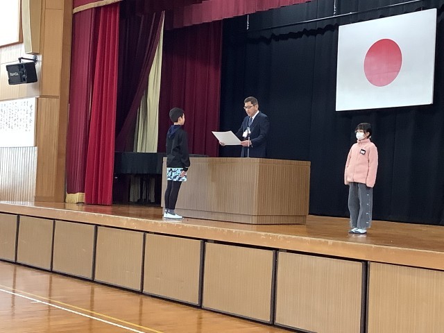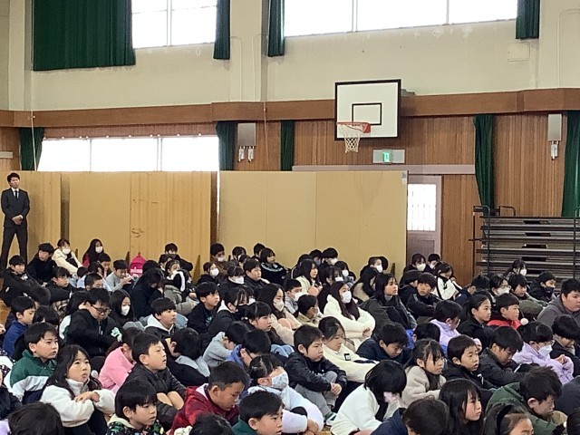 3学期の始業式がありました。校長先生から、冬休みの食べ物から新しい発見があったこと、これからも、自分の考え、思いを自分の言葉で伝えることをさらに頑張りましょうと話がありました。児童会長からは、頑張りたいことの発表がありました。また児童会として、あいさつをするメリットやなぜあいさつが必要なのかを知らせていきたいと話しました。最後に安城市青少年健全育成顕彰等の表彰がありました。