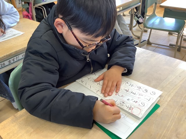 1年生は、初めての書き初め会。みんな緊張していました。はらいやはねなどに気をつけて取り組みました。