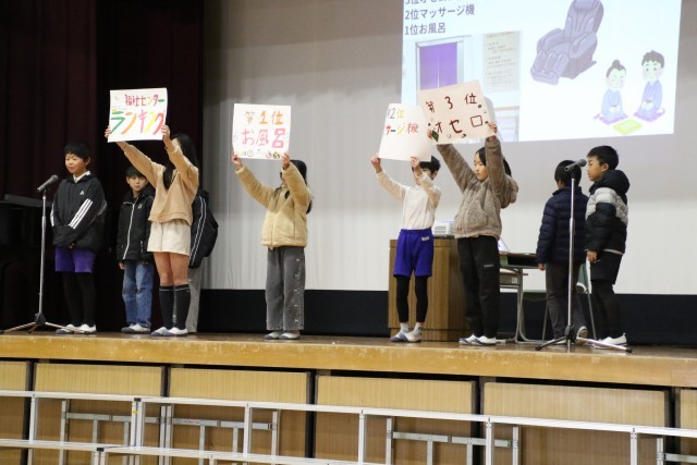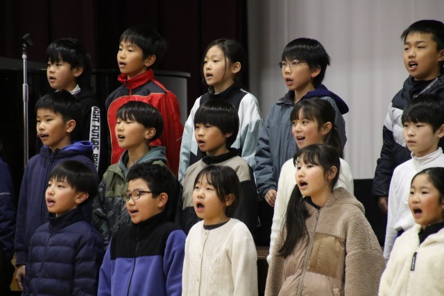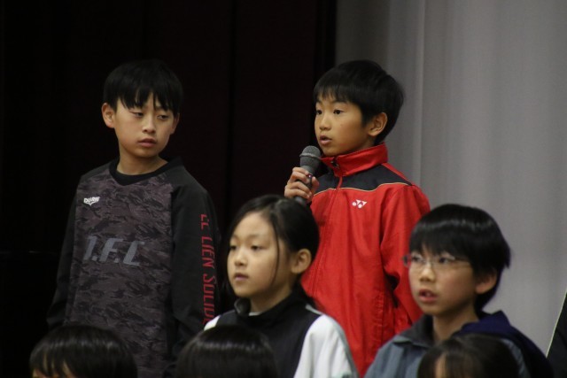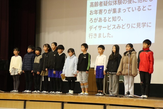 総合的な学習の時間で取り組んできた「お年寄りと心をつなげよう」について発表しました。お年寄りについて調べてきたこと、お年寄りと触れ合って感じたことをお家の人や地域の人に知ってもらおうと、何度も練習を重ねました。笑顔で自信をもって台詞を言う姿や一生懸命歌う姿を多く見ることができました。「緊張したけど楽しかった。」と振り返る児童も多くおり、練習の成果を発揮することができました。
