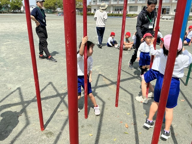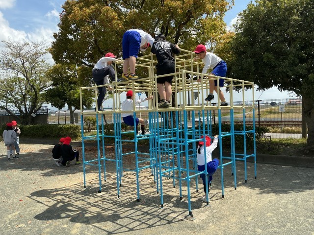今年度、初めての体育でした。遊具で遊ぶ時のルールを確認しながら、遊びました。