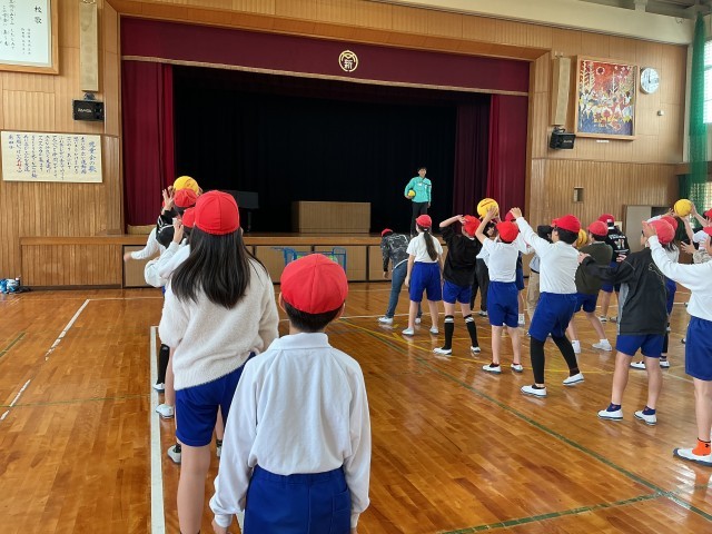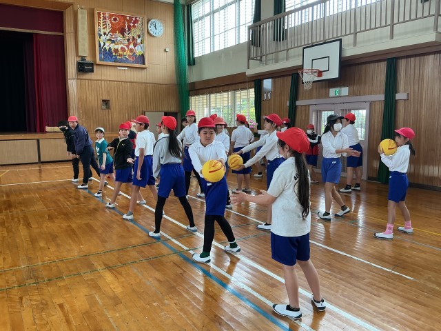 学年合同体育で体ほぐし運動をしました。体を柔らかくする運動や、ボールやフラフープを使ってで全身動かしたりしました。心と体をほぐすことができました。
