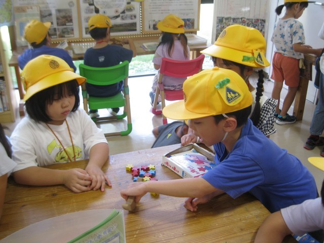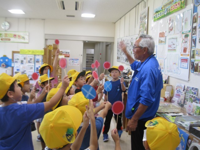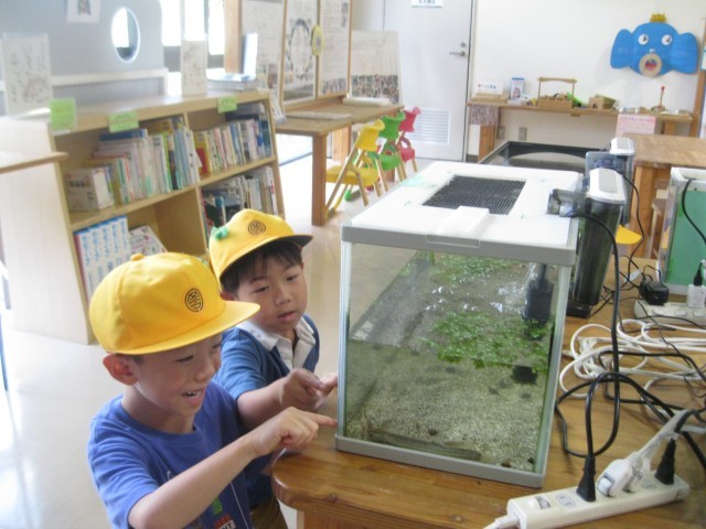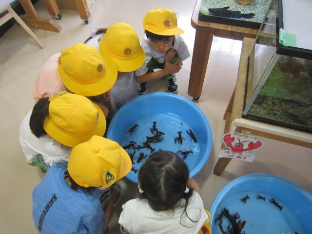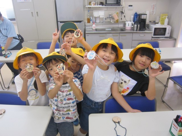 「エコきち」では、木のペンダントを作りました。木に自分の好きな絵を描いて、自分だけのすてきなペンダントができました。他にも安城市にいる生き物について教えてもらいました。○×クイズをしたり、ザリガニがえさを食べる様子を実際に見たりすることができました。