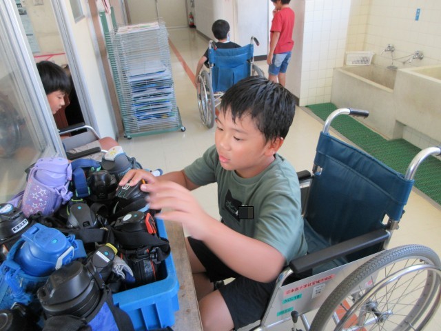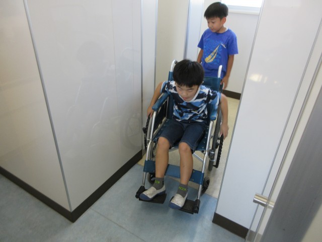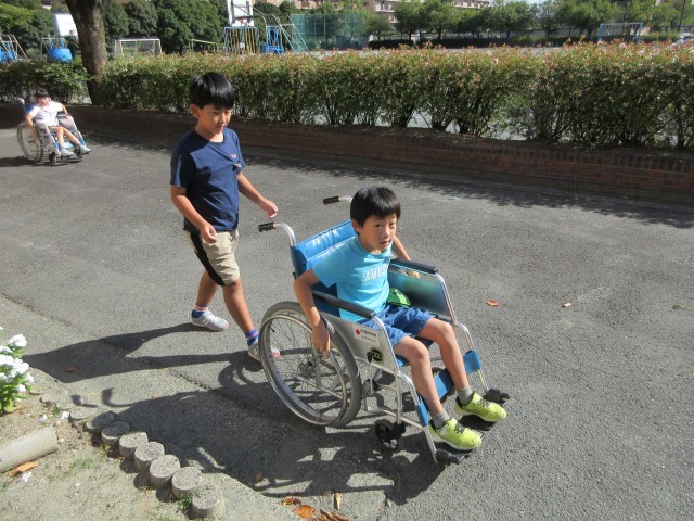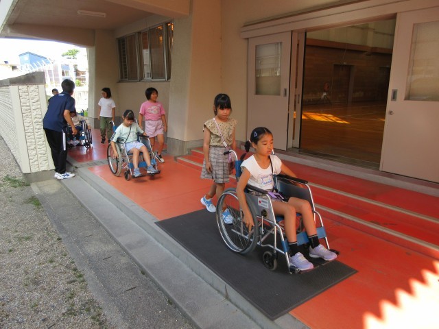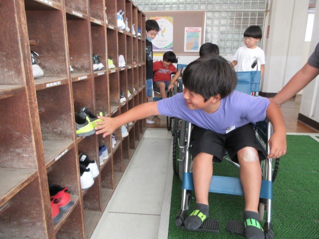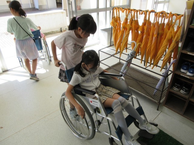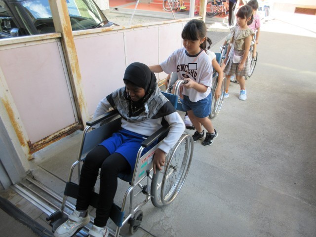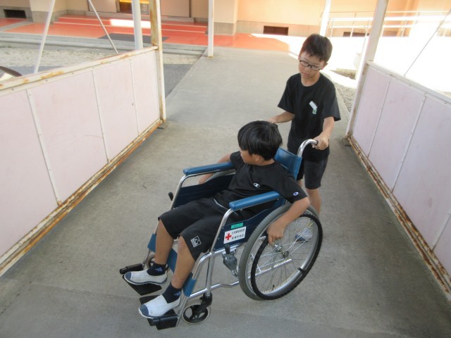 総合的な学習の時間「福祉学習」の一環として車いす体験を行いました。事前に校内での生活を振り返り、大変なことやサポートのしかたを考えました。実際に体験することで、事前学習では気付かなかった困り感や、サポートの重要性を実感することができました。自分たちにできることを考えたり、肢体不自由の方の生活についてもっと知りたいという気持ちを高めたりすることができました。