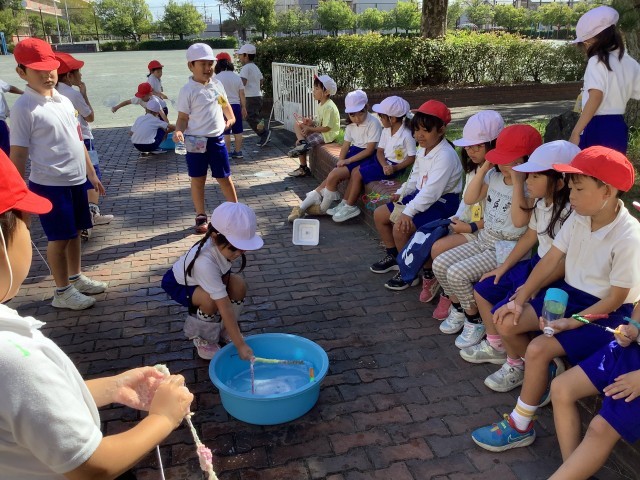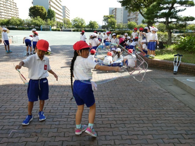 「貸して」「いいよ」と友達の道具を借りつつ、学年全員でシャボン玉を楽しみました。