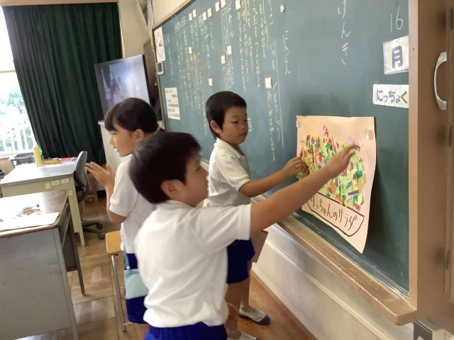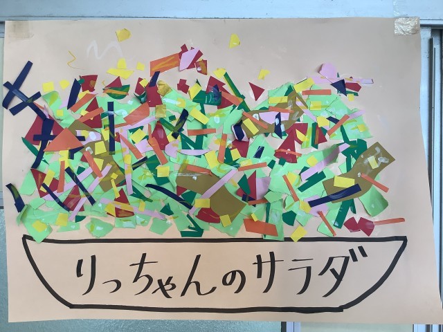 このサラダに「ねばり強くなるように、オクラを入れたい。」「髪がさらさらになるように、わかめを入れたい。」「早く泳げるように、マグロを入れたい。」など、もっともっとおいしくなるサラダを考えました。